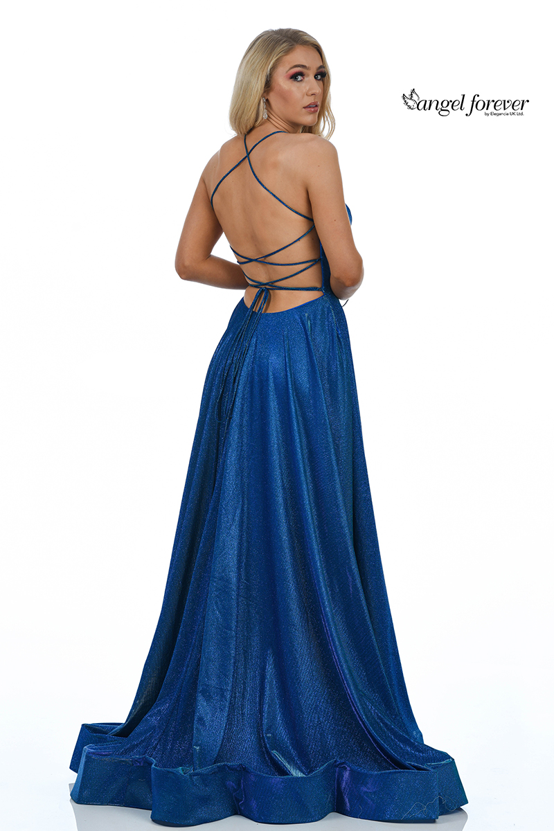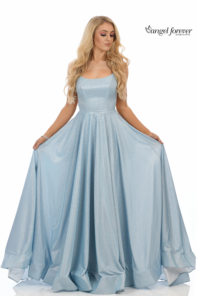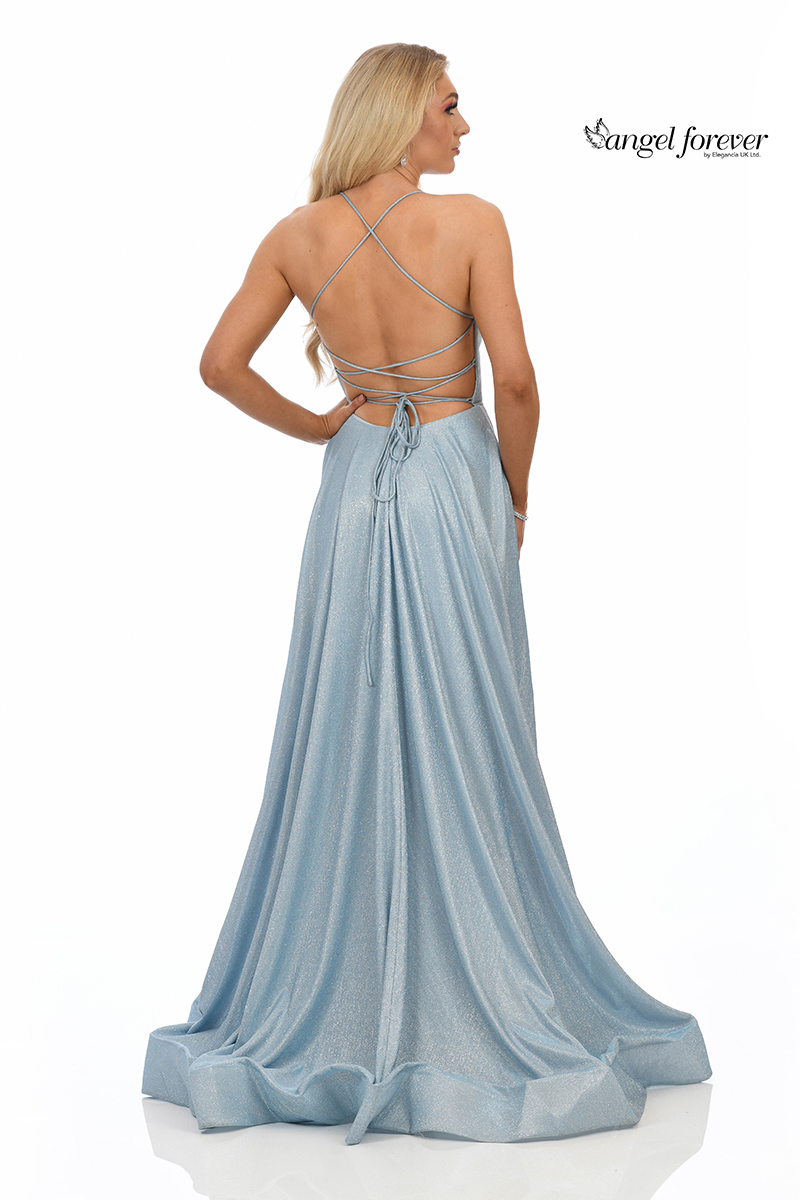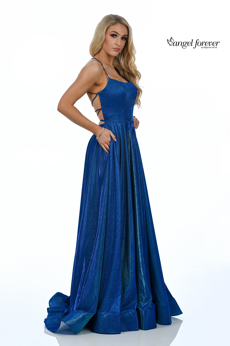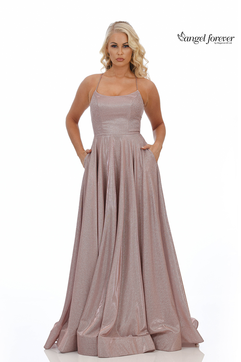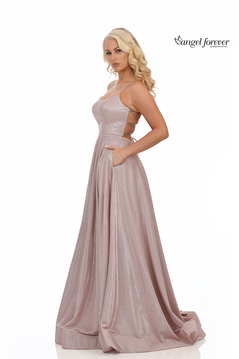 Dazzle at the prom in this shimmering glitter fabric a-line gown with spaghetti straps, tie back and pockets to skirt, perfect for those essential beauty products and smart phone. Wow the party in this fashion forward style.