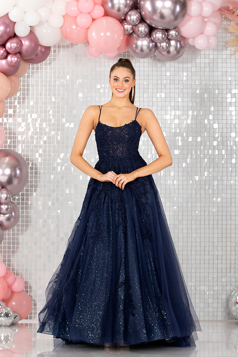 This decadent ballgown features an a-line silhouette, with all over glitter tulle, lace bodice with beading, and a scoop neckline with spaghetti straps that flow to a corset back. A gorgeous style that will wow the party guests.